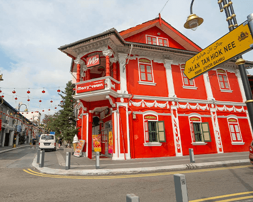 Vibrant cultural street with heritage buildings, local eateries, and cafés.